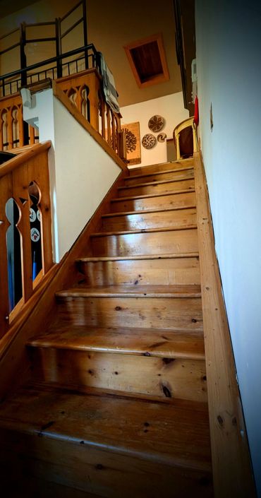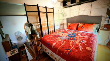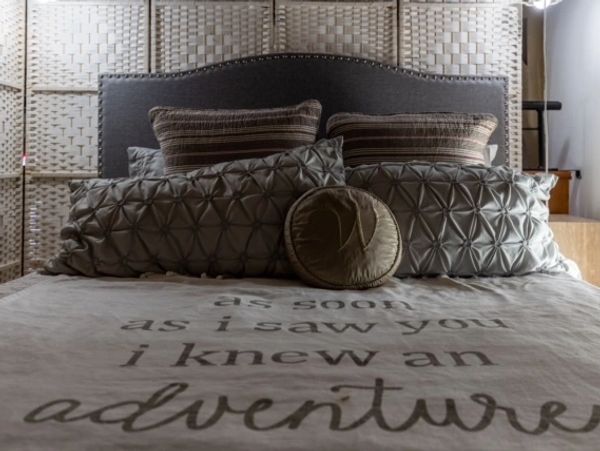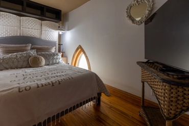 Follow the staircase to a charming loft-style bedroom, where a plush queen bed awaits. Thoughtfully furnished with bedside tables and soft side lighting, the space offers a peaceful, romantic ambiance—perfect for unwinding after a day of exploring or celebrating.